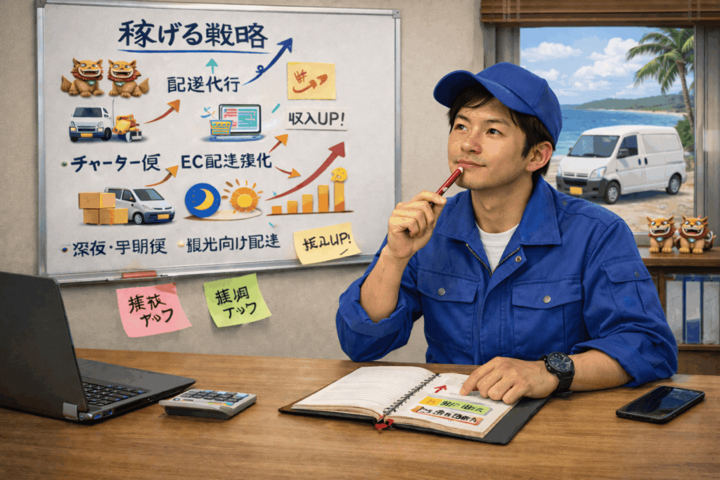 沖縄で委託ドライバーの収入を伸ばしていくうえで、かなり現実的な選択肢になるのが「掛け持ち」です。1つの案件だけだと、物量が少ない日や閑散期に売上がガクッと落ちることがありますが、複数の仕事を組み合わせることで、その波をある程度ならしていくことができます。